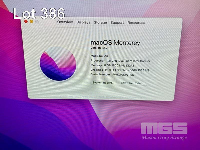 LAPTOP, APPLE MACBOOK AIR (A1466), CORE i5 5350U (5TH GEN) @ 1.8GHz, 8GB DDR3 RAM, 128GB SSD, 13.3" DISPLAY (1440x900), INTEL HD GRAPHICS 6000, Wi-Fi, BLUETOOTH, MAC OS 12 INSTALLED (NO POWER SUPPLY) (NOTE: BATTERY NOT CHARGING) S/N:FVHXPJSPJ1WK