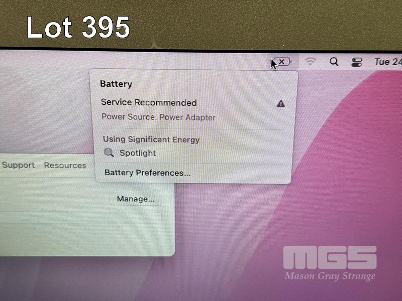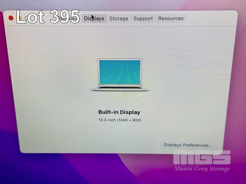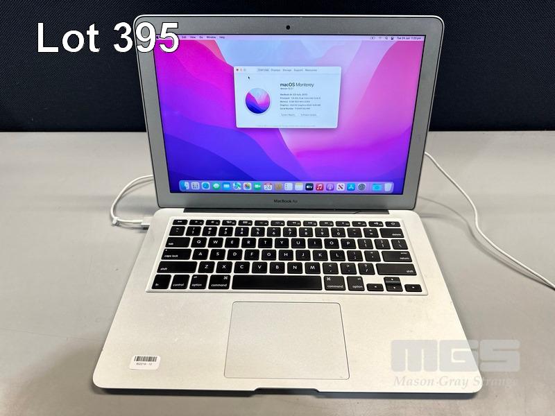 LAPTOP, APPLE MACBOOK AIR (A1466), CORE i5 5350U (5TH GEN) @ 1.8GHz, 8GB DDR3 RAM, 128GB SSD, 13.3" DISPLAY (1440x900), INTEL HD GRAPHICS 6000, Wi-Fi, BLUETOOTH, MAC OS 12 INSTALLED (NO POWER SUPPLY) (NOTE: DAMAGED SCREEN HINGE, "BATTERY SERVICE RECOMMENDED" MESSAGE, BATTERY NOT CHARGING) S/N:FVHXPF58J1WK