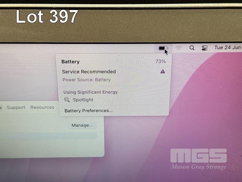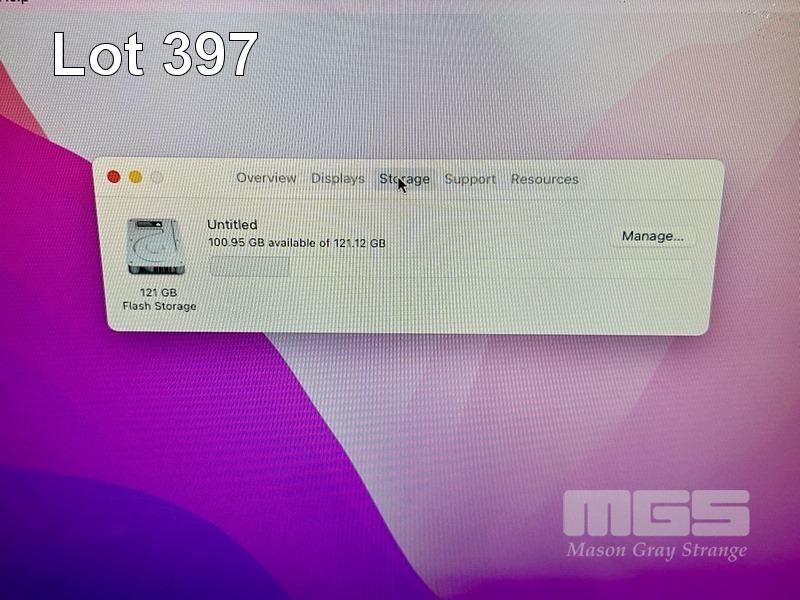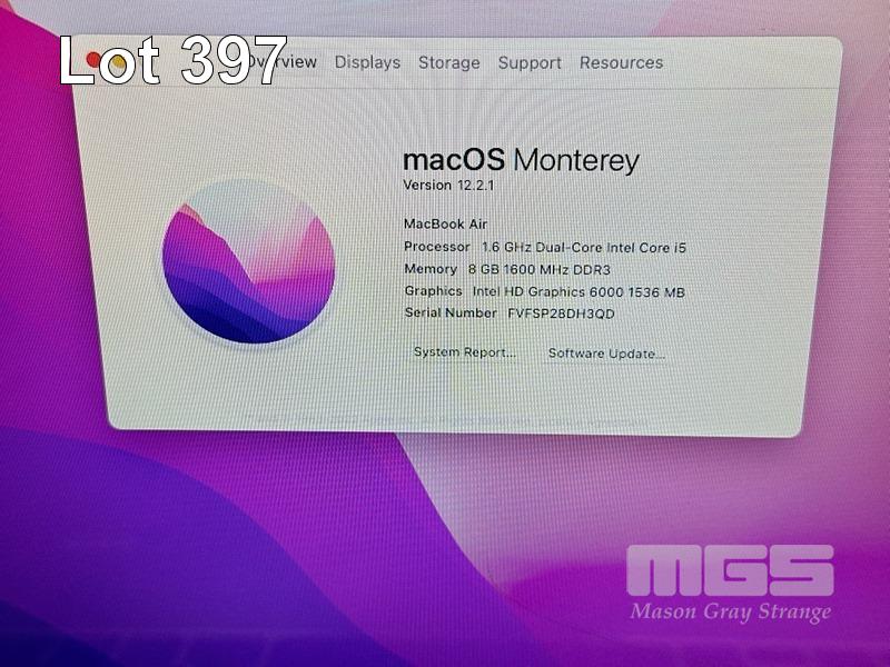 LAPTOP, APPLE MACBOOK AIR (A1466), CORE i5 5250U (5TH GEN) @ 1.6GHz, 8GB DDR3 RAM, 128GB SSD, 13.3" DISPLAY (1440x900), INTEL HD GRAPHICS 6000, Wi-Fi, BLUETOOTH, MAC OS 12 INSTALLED (NO POWER SUPPLY) (NOTE: SCRATCH ON SCREEN, "BATTERY SERVICE RECOMMENDED" MESSAGE) S/N:FVFSP28DH3QD