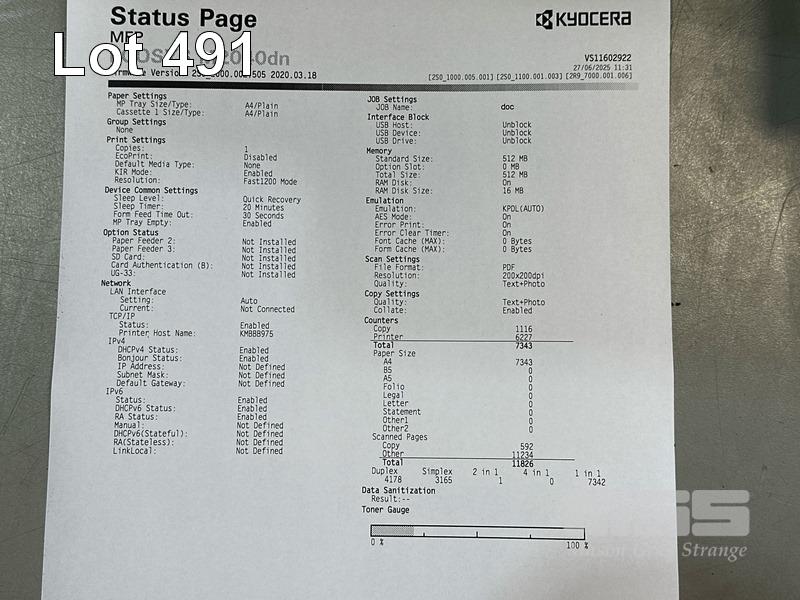 PRINTER, KYOCERA ECOSYS M2040dn MONO LASER MULTIFUNCTION, ADF, USB, NETWORK, 7,343 PAGES (TEST PAGE ATTACHED) S/N:VS11602922