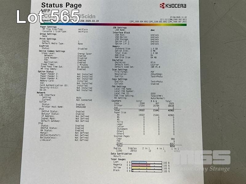 PRINTER, KYOCERA ECOSYS M6535cidn COLOUR LASER MULTIFUNCTION, ADF, USB, NETWORK, 19,322 COLOUR & 21,641 B&W PAGES (TEST PAGE ATTACHED) S/N:V6F7Y01461