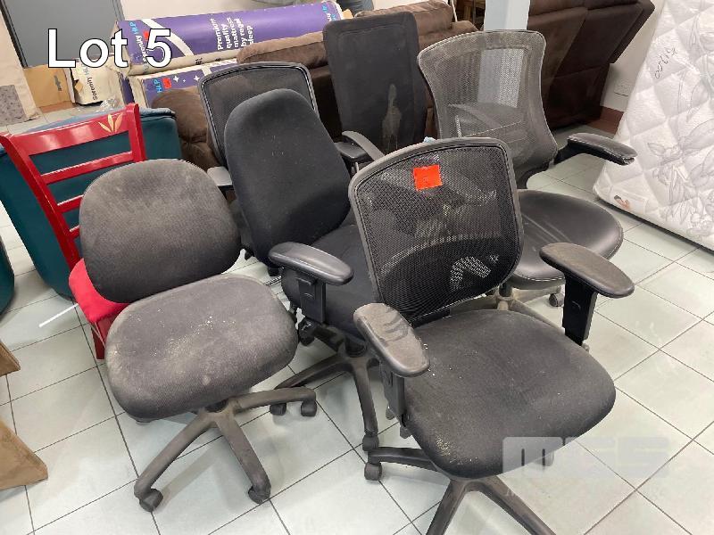 5 x OFFICE CHAIRS, 1 x BLACK STOOL & 1 x RED TIMBER CHAIR
