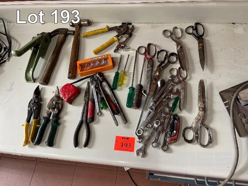 LARGE QUANTITY ASSORTED HAND TOOLS, FABRIC SCISSORS, TIN SNIPS, HAMMERS, SPANNERS, ETC