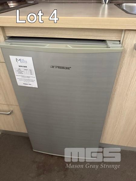 ROOM 4 (87) COMPRISING ALL REMOVABLE CHATTELS, INCLUDING KINGSIZE ENSEMBLE WITH HEADBOARD & LINEN 2 x BEDSIDE TABLE LAMPS WITH ROUND WHITE SHADE 2 x STAINLESS STEEL DRUM STYLE BEDSIDE TABLES, 50cm VIVO 46" LCD HD TELEVISION NESPRESSO COFFEE MACHINE, MODEL VERTUO POP GDV2 TUB STYLE ARM CHAIR, TIMBER FRAMED, BEIGE VINYL DINING TABLE, 100cm DIAMETER, TIMBER & 4 DINING CHAIRS PESKOE BAR FRIDGE STAINLESS STEEL MICROWAVE OVEN, SENSOR TOUCH CONTROLS IRON & COMPACT IRONING BOARD KETTLE, TOASTER, FRYPAN, CUTLERY, CROCKERY & GLASSWARE 3 x FRAMED PRINTS 2 x BINS YEALINK TELEPHONE HANDSET