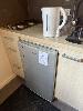 ROOM 14 (77) COMPRISING ALL REMOVABLE CHATTELS, INCLUDING KINGSIZE ENSEMBLE WITH HEADBOARD & LINEN 2 x BEDSIDE TABLE LAMPS WITH ROUND WHITE SHADE 2 x STAINLESS STEEL DRUM STYLE BEDSIDE TABLES, 50cm VIVO 46" LCD HD TELEVISION NESPRESSO COFFEE MACHINE, MODEL VERTUO POP GDV2 TUB STYLE ARM CHAIR, TIMBER FRAMED, BEIGE VINYL DINING TABLE, 100cm DIAMETER, TIMBER & 4 DINING CHAIRS PESKOE BAR FRIDGE STAINLESS STEEL MICROWAVE OVEN, SENSOR TOUCH CONTROLS IRON & COMPACT IRONING BOARD KETTLE, TOASTER, FRYPAN, CUTLERY, CROCKERY & GLASSWARE 3 x FRAMED PRINTS 2 x BINS YEALINK TELEPHONE HANDSET