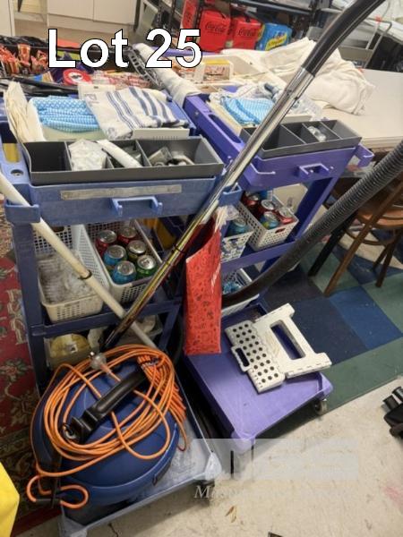 3 x CLEANERS TROLLEYS, 3 TIER WITH ROOM SUPPLIES & 1 x PACVAC VACUUM CLEANER