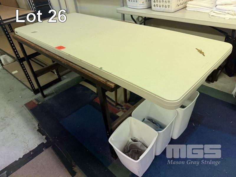 3 BAYS STEEL STOCK SHELVING, EACH 180cm (H) 3 & 5 TIER, 2 x LIFELINE PVC TRESTELS, 180cm 3FT STEP LADDER, SAFETY STEP & LAUNDRY BASKETS