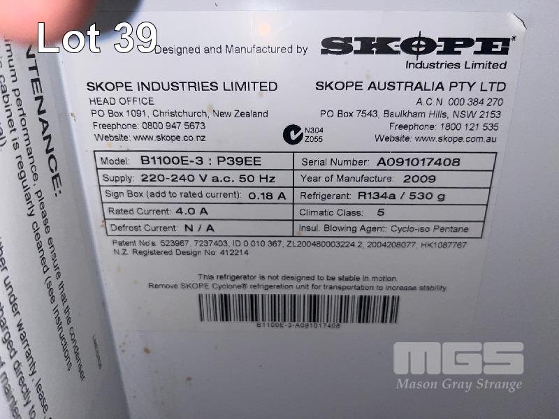 UPRIGHT DISPLAY FRIDGE, SKOPE MOD: B1100E-3:P39EE DOM: 2009 2 DOOR ILLUMINATED, DRO 240V, 10 AMP PLUG