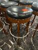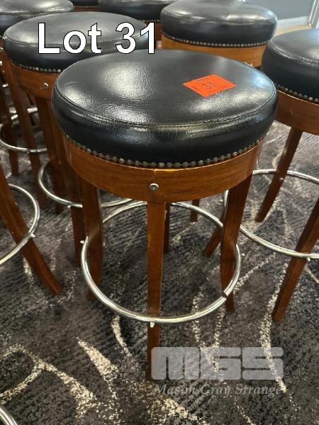 6 x TIMBER BAR STOOLS, BLACK VINYL TOPS, 760mm (H)