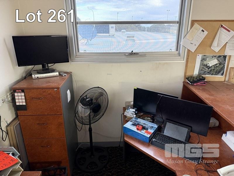 SUNDRY IT EQUIPMENT COMPRISING 2 x AOC 23"MONITORS, BENQ 24" MONITOR, LASER BLU RAY PLAYER, MODEL BD300, TABLET COMPUTER, PEDESTAL FAN, TCL 32" MONITOR, ETC