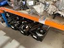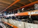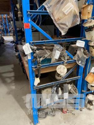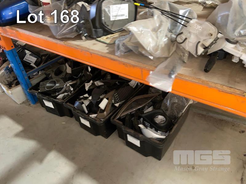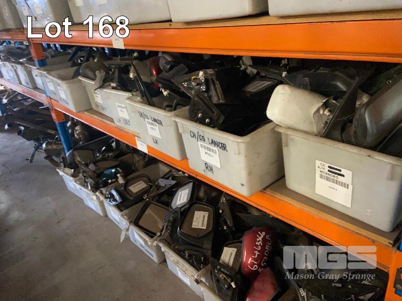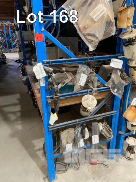 ROW OF RACKING PARTS INCLUDING MIRRORS, TAIL LIGHTS, EXHAUSTS, MUFFLERS, IGNITION SWITCHES, 4 BAYS OF RACKING