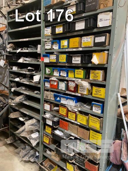 2 x STEEL SHELF UNITS & CONTENTS PARTS, ELECTRICAL SWITCHES, CAMERAS, SENSORS, WIPER MODULES & MORE