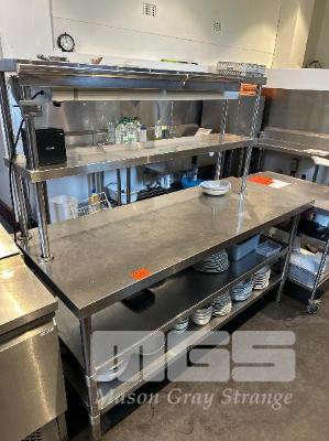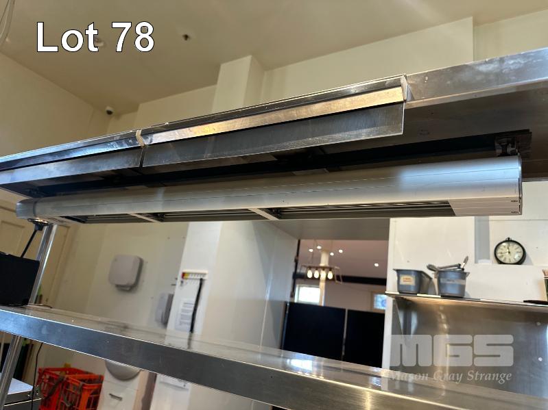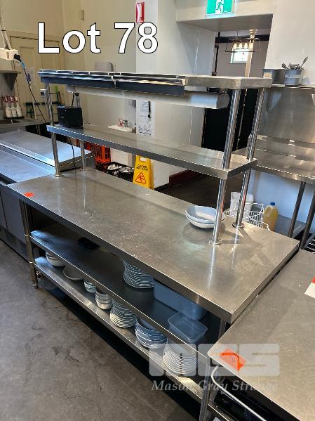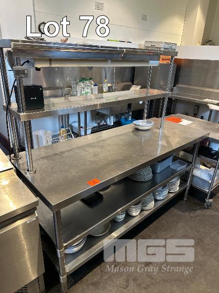 CENTER ISLAND STAINLESS STEEL BENCH, 1800 x 700mm WITH 2 TIER SHELF & ROBAND HEAT LAMP, MOD: HE1200, 240V 10amp