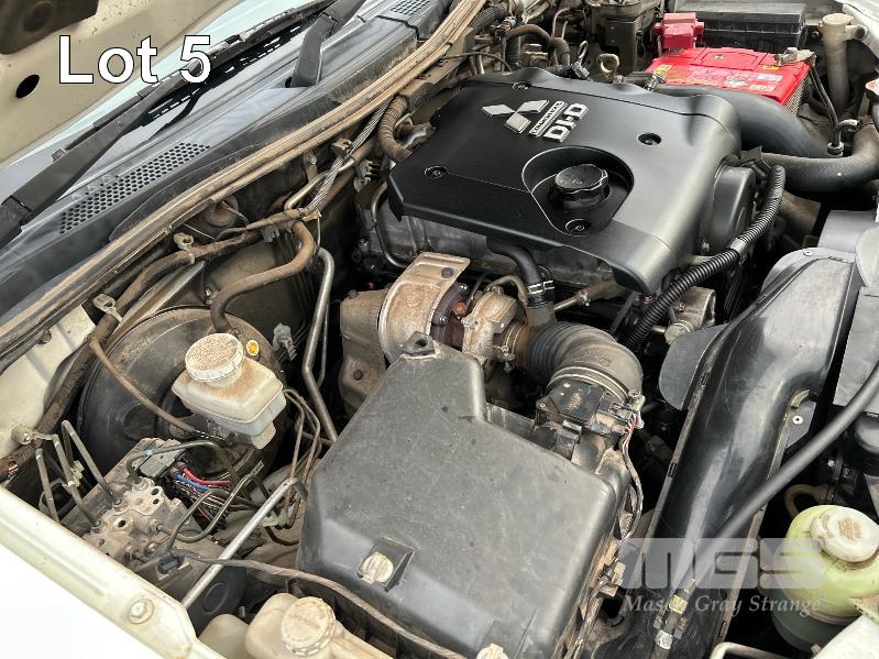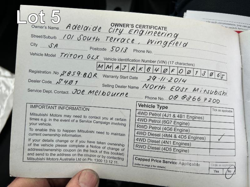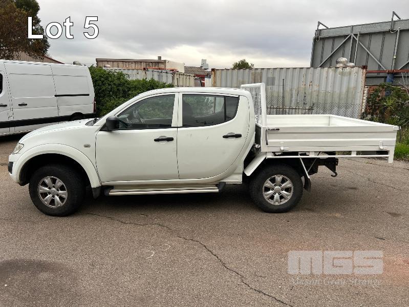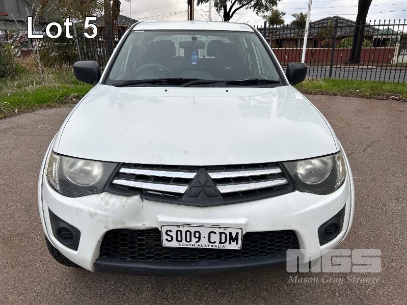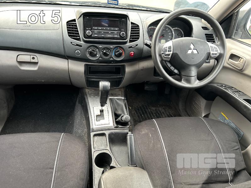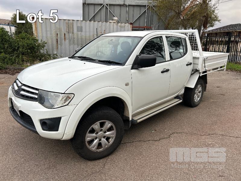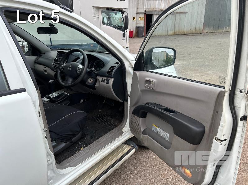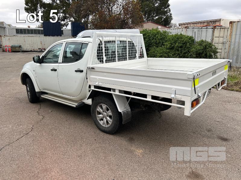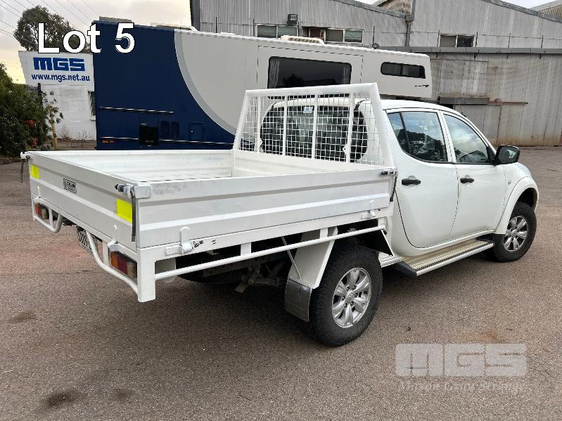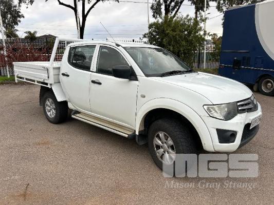 2014 MITSUBISHI TRITON KA/KB GLX DUAL CAB TRAY TOP 4x4 REG: S009 CDM VIN: MMAJRKB40FD013065 ODO: 152,694kms SHOWING 4 CYLINDER TURBO DIESEL, AUTOMATIC TRANSMISSION, WHITE DUCO, 4 DOORS, 5 SEAT, 4x4 ABS, AIR BAG, AIR CON, CARGO BARRIER, CD PLAYER, CENTRAL LOCKING, CRUISE CONTROL, POWER STEERING, POWER WINDOWS, SIDE STEP, STEEL TRAY, KEY #6 (WITH 1 KEY/S, WITH OWNER'S MANUAL, WITH SERVICE BOOKS) CONDITION: FRONT BUMPER - IMPACT DAMAGE