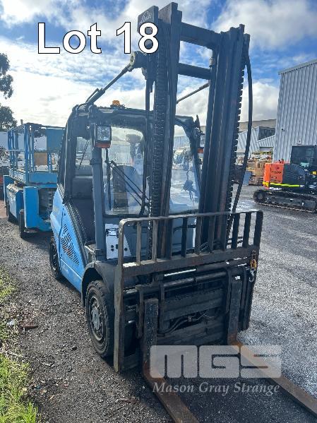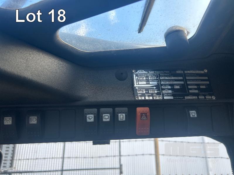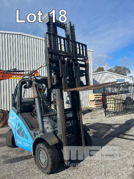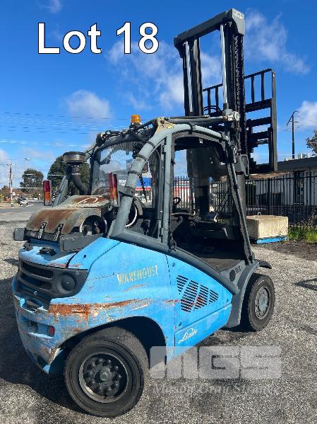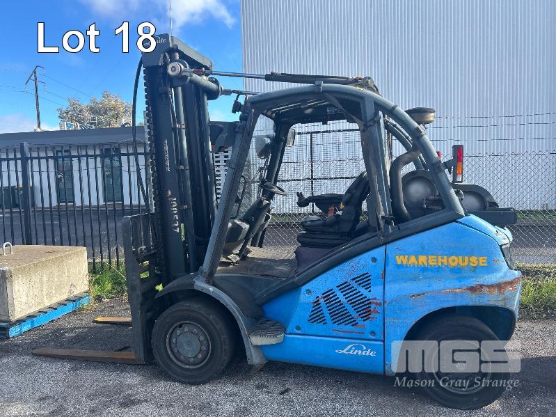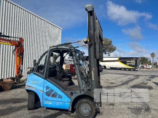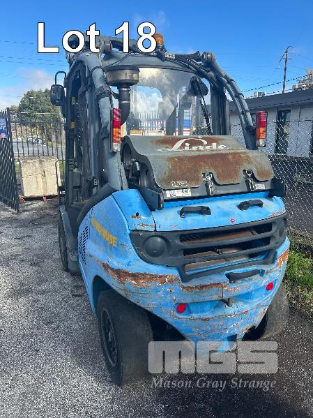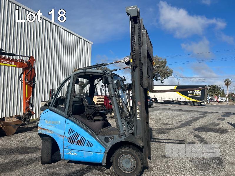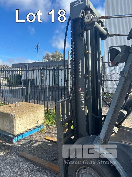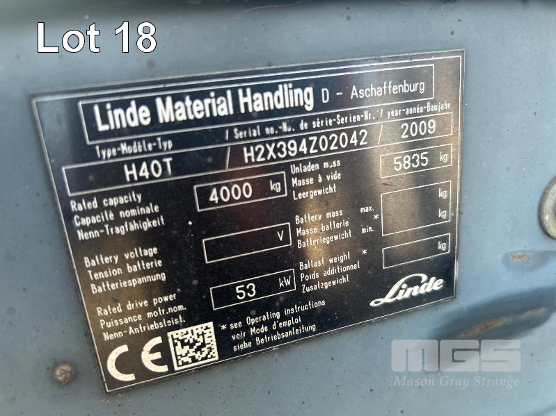 2009 FORKLIFT, LINDE MOD: H40T S/NO: H2X394Z02042 RATED CAP: 4,000kg 5 CYLINDER LPG ENGINE, 53kw HOURS: 7,144 SHOWING 2 STAGE CLEARVIEW MAST WITH TYNE POSITIONING, CARRIAGE EUROLIFT LPFP1350 RATED CAP: 3,500kg @ 500mm LIFT HEIGHT: 4,100mm FORK LENGTH: 1,200mm DIGITAL WEIGHT SCALE UNIT, ACE SLIMLINE II MOD: GRQX-2005 KEYPAD LOCK OUT (PIN CODE IN OFFICE STOCK SHEET) SOLID TYRES, TWIN LPG GAS BOTTLES