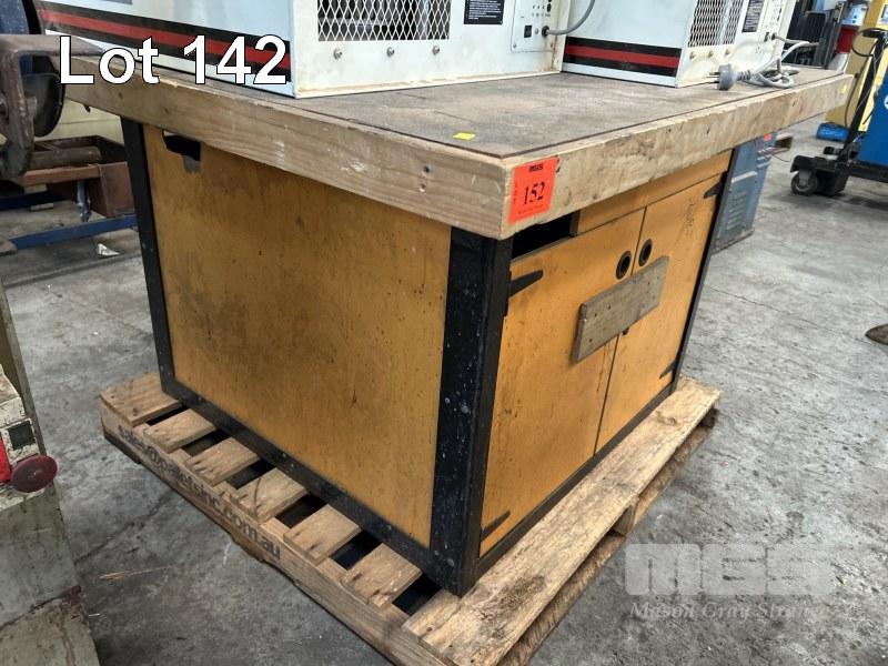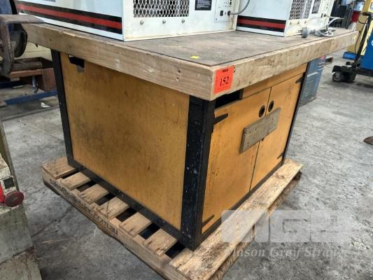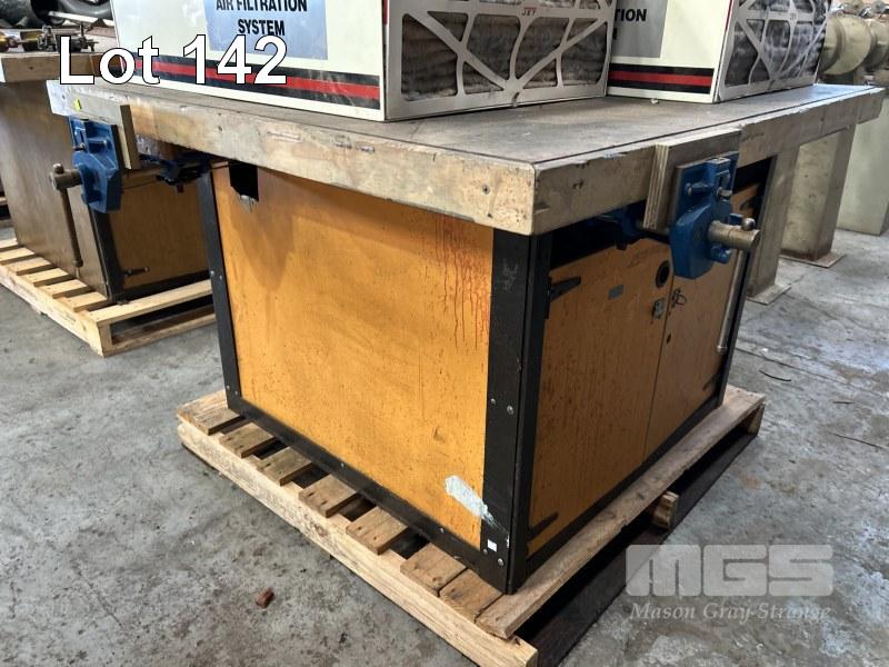 TIMBER WORK BENCH, 1250 x 1400 x 830mm (H), WITH 2 x DAWN VICES, 175mm & 1 x CLAMP VICE, 175mm WITH UNDER BENCH STORAGE