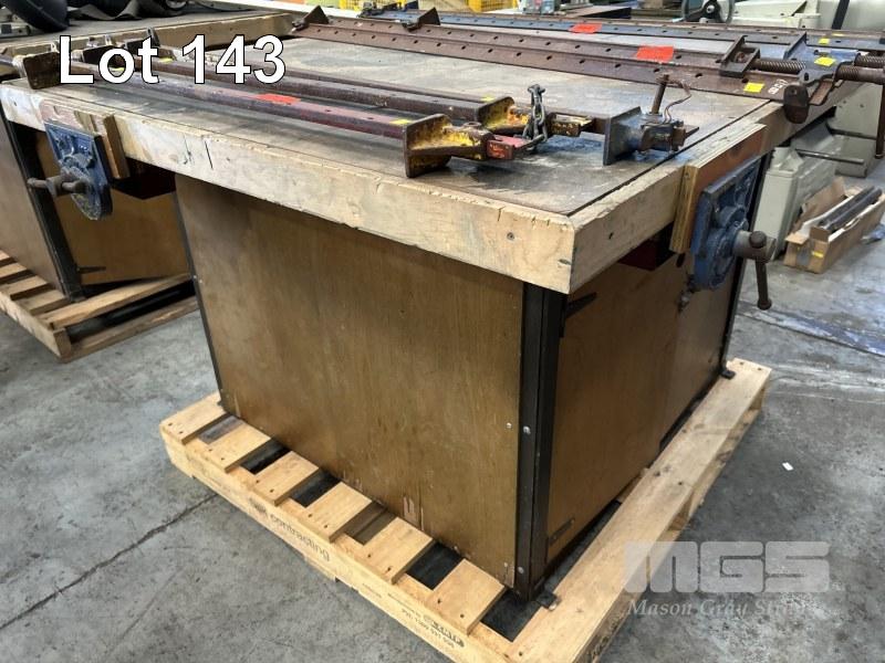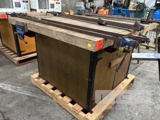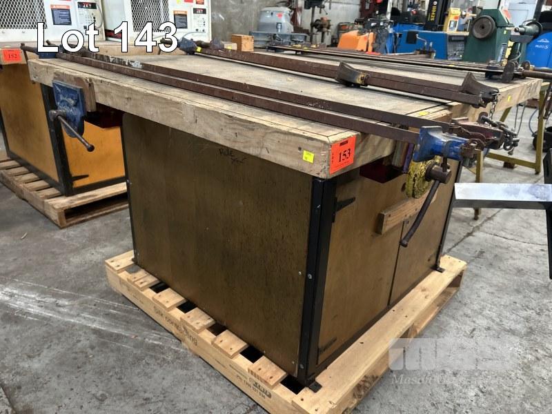 TIMBER WORK BENCH, 1250 x 1400 x 830mm (H), WITH 3 x DAWN VICES, 175mm WITH UNDER BENCH STORAGE