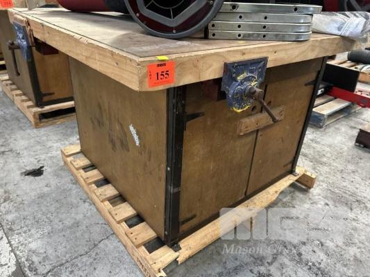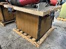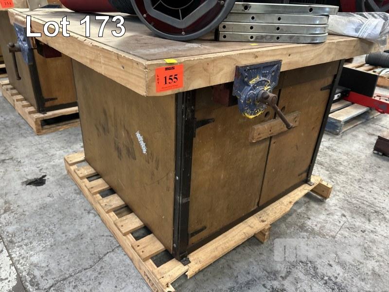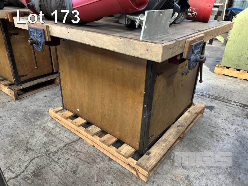 TIMBER WORK BENCH, 1250 x 1400 x 830mm (H), WITH 3 x DAWN VICES, 175mm WITH UNDER BENCH STORAGE
