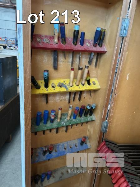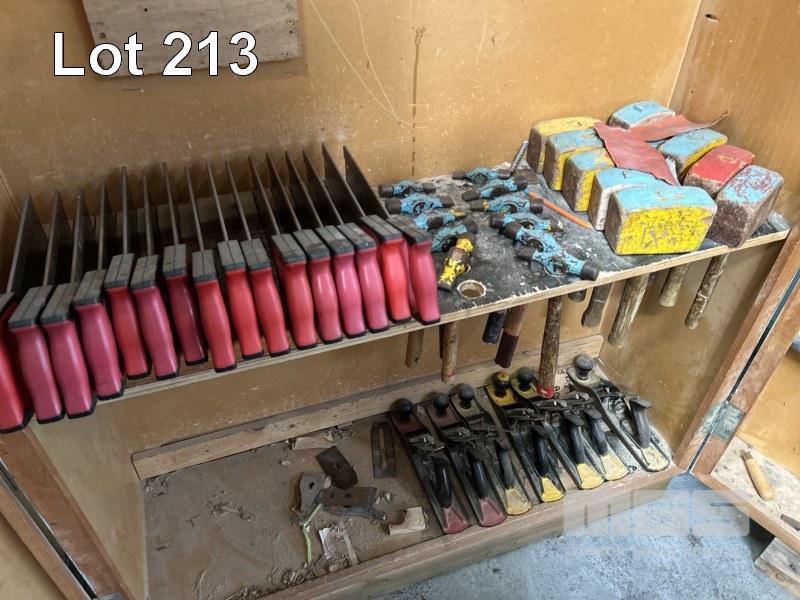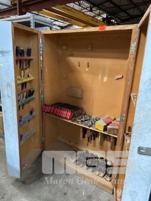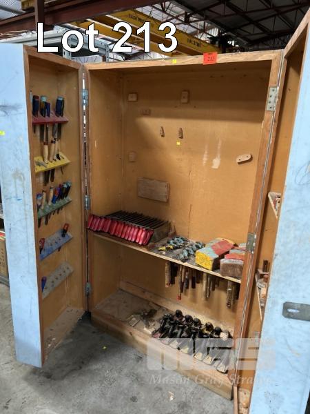 TOOL STORAGE CABINET, 1200 x 1940mm (H), 2 DOOR, TIMBER WITH ASSORTED WOOD WORKING TOOLS INCLUDING PLANERS, FILES, HAMMERS, SAWS & RULERS, ETC