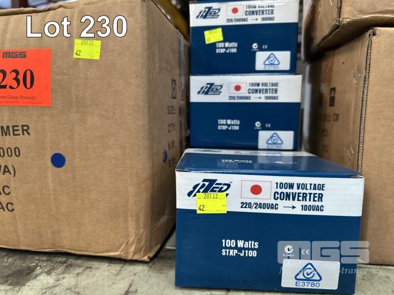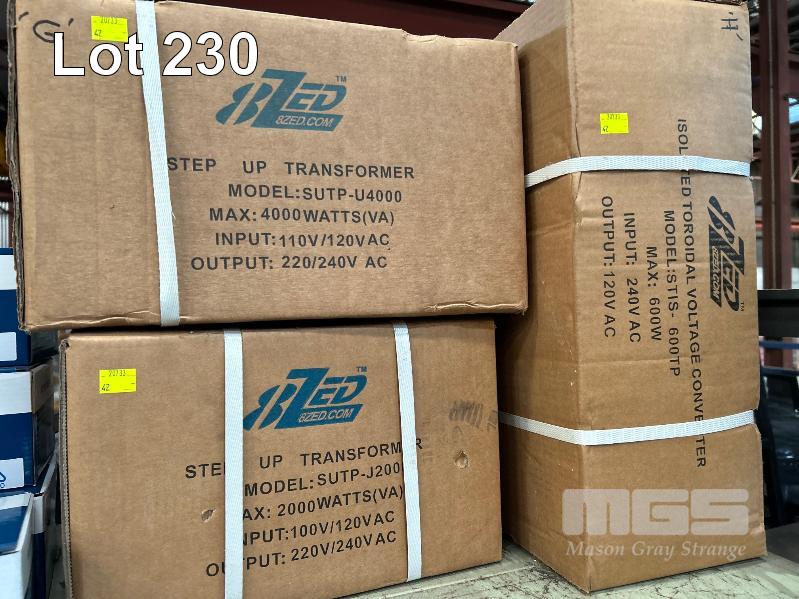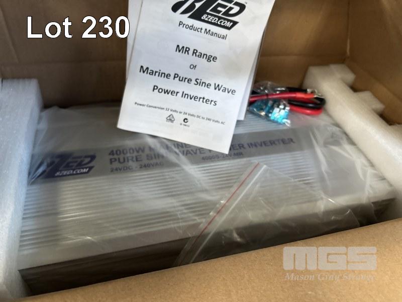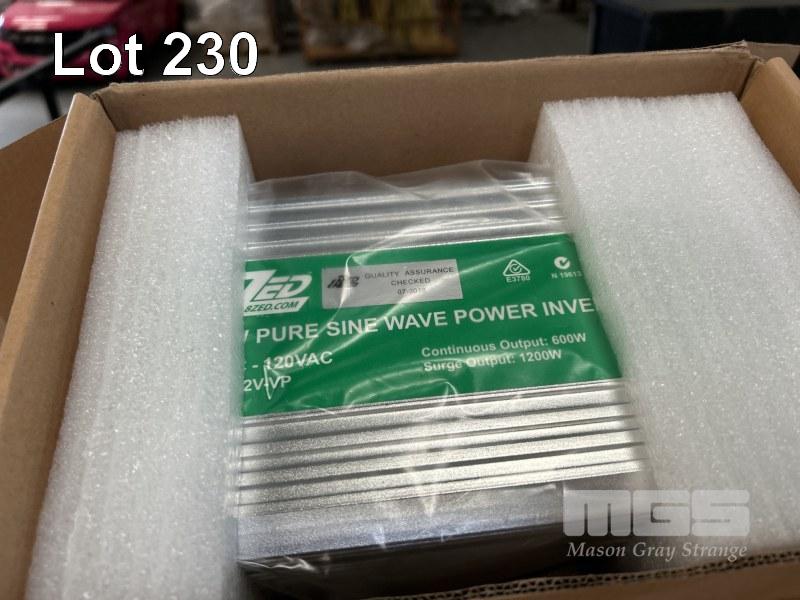 3 x POWER INVERTERS, 8 ZED, PURE SINE WAVE 4000w- 24V DC TO 240VAC, 1000w -12V DC TO 240VAC, 600w - 12V DC TO 120VAC, 3 x POWER TRANSFORMERS INCLUDING 5000w - 240V TO 120VAC, STEP DOWN 4000w - 120V TO 240VAC, STEP UP, 2000w - 120V TO 240VAC, STEP UP, 2 x 600w - 240V TO 120VAC, STEP DOWN, 4 x 100w - 240V TO 120VAC, STEP DOWN