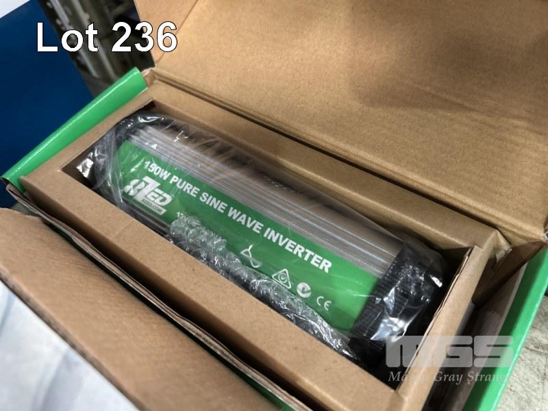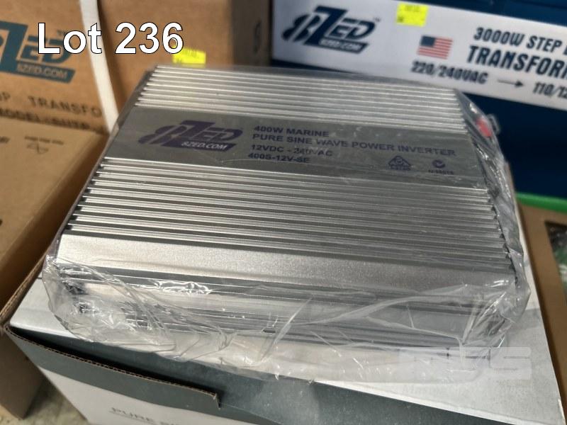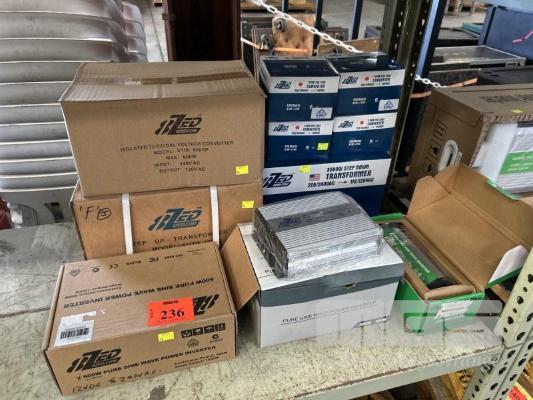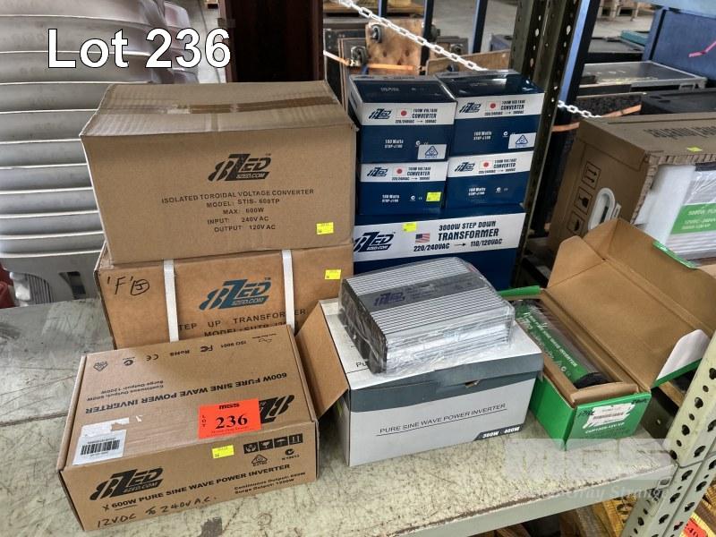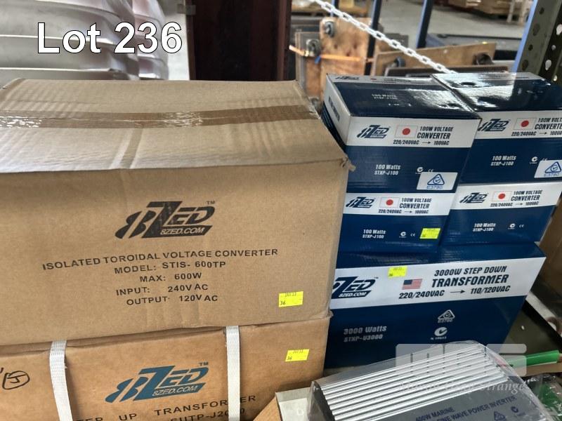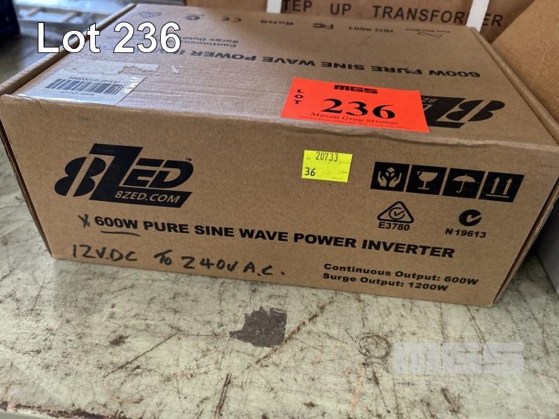 3 x POWER INVERTERS, 8 ZED, PURE SINE WAVE INCLUDING 600w - 12V DC TO 240VAC, 400w - 12V DC TO 240VAC, 150w - 12V DC TO 240VAC STEP DOWN CONVERTERS INCLUDING 3000w, 240V TO 120VAC 600w, 240V TO 120VAC 4 x 100w, 240V TO 120VAC, STEP UP 2000w- 120V TO 240VAC AS NEW 6 x STEP DOWN POWER CONVERTERS, 240V TO 100VAC, 1000w AS NEW