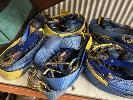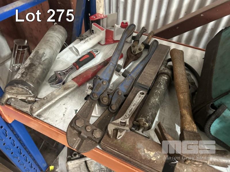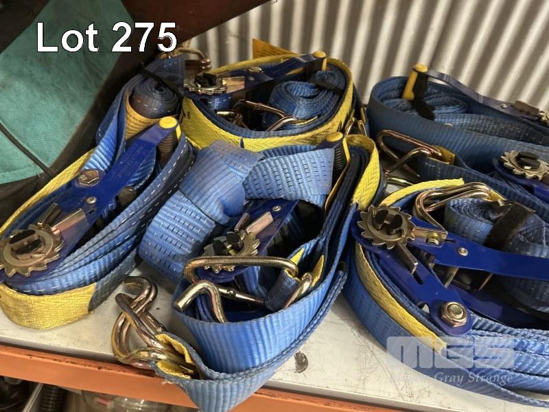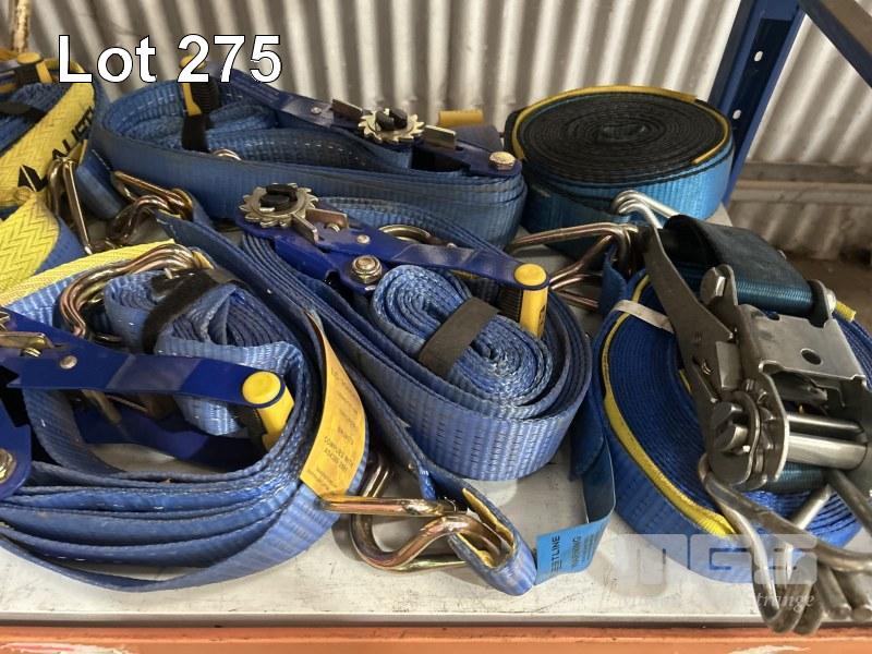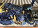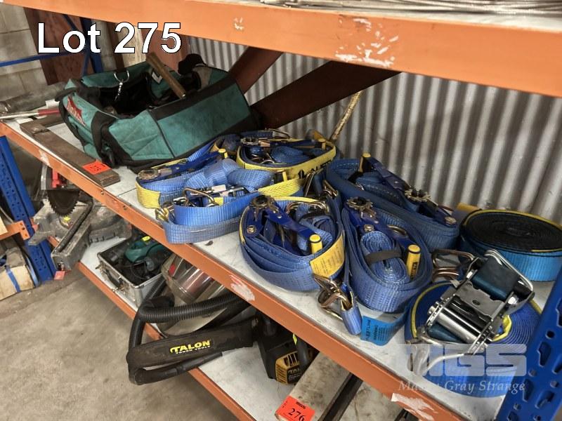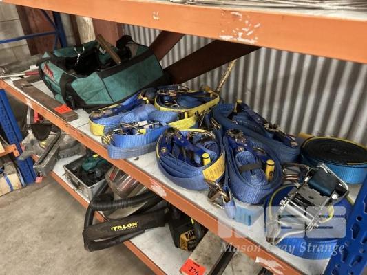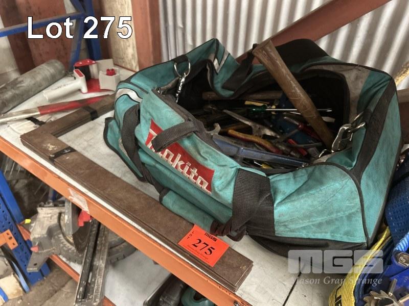 MAKITA TOOL BAG WITH ASSORTED HAND TOOLS, INC. SET SQUARES, SHIFTERS, CUTTERS HAMMERS, BOLT CUTTERS, GREASE GUNS, ETC WITH 7 x HEAVEY DUTY RATCHET STRAPS