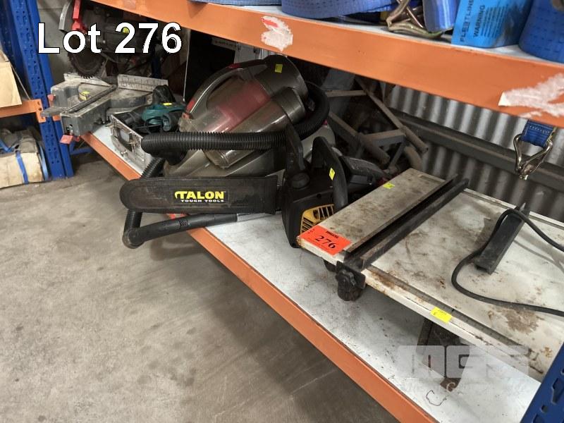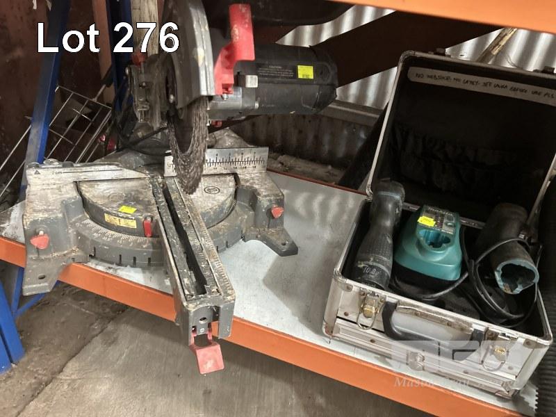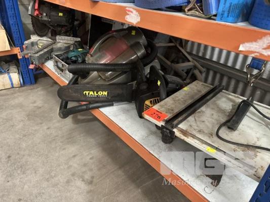 SLIDING MITRE SAW, OZITO, 240mm BLADE, 240V, 2 x MAKITA DRIVERS, CORDLESS WITH BATTERY, CHARGER & CARRY CASE, TILE SAW, COSCUT, 240V, CHAINSAW, TALON & VACUUM CLEANER, KOGAN, 240V 1 x SHELF
