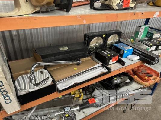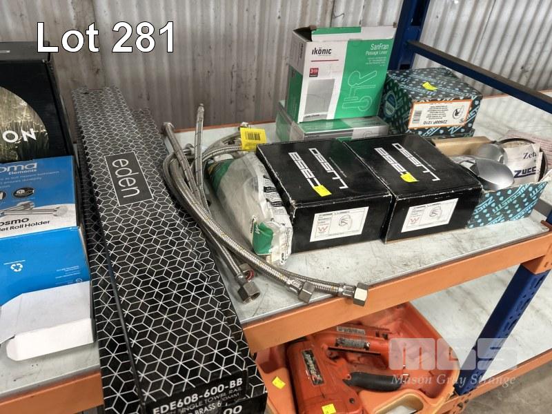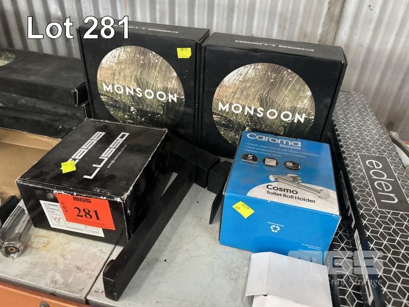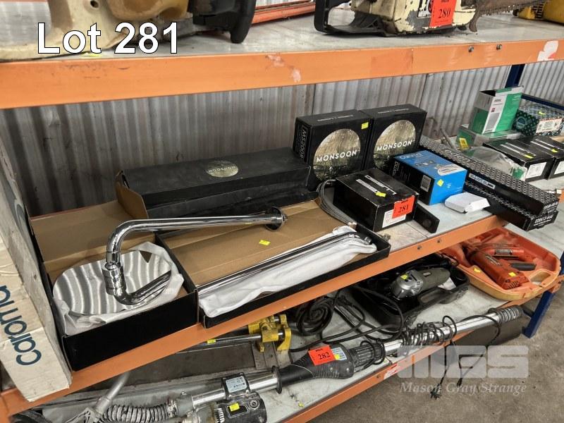 ASSORTED BATHROOM WARE INCLUDING SHOWER HEAD, TAPS, TOWEL RAILS,
