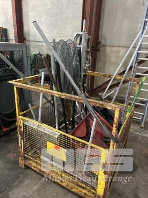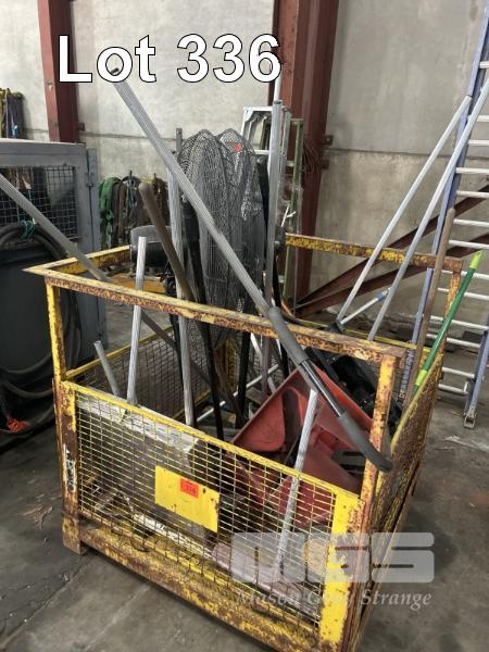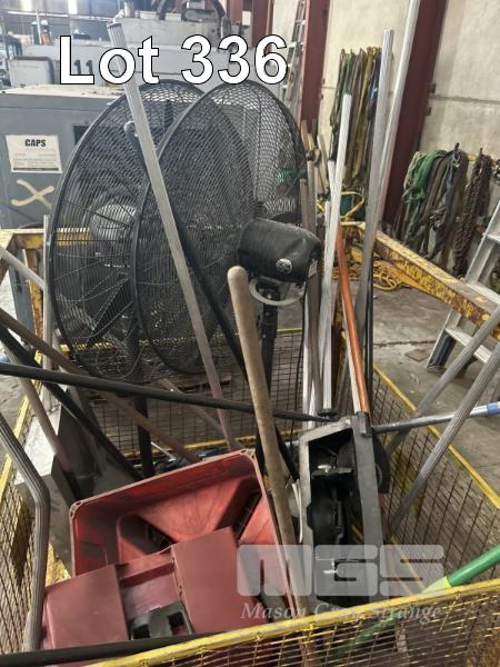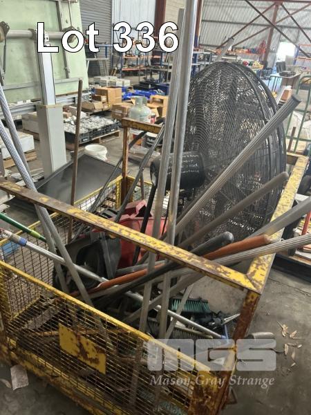 2 x WORKSHOP FANS, BROOMS, STEP, SWEEPER, SCOOPERS INCLUDING STILLAGE