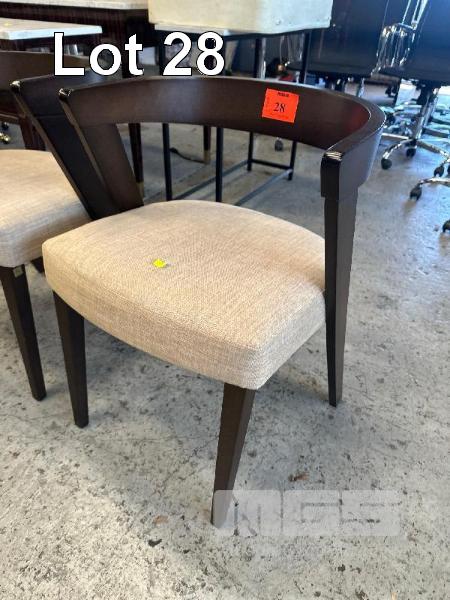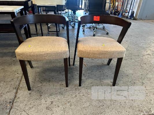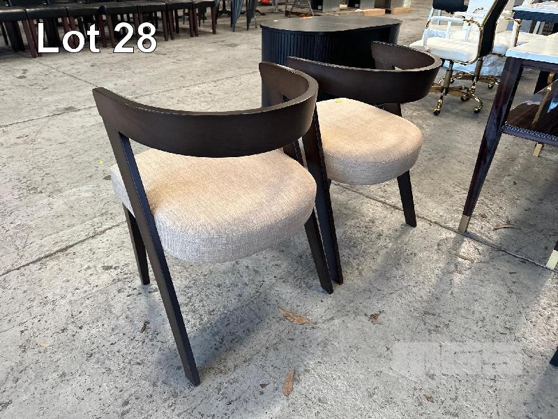 2 x CUSHIONED DINING CHAIRS BEIGE CLOTH SEAT, DARK TIMBER BASE