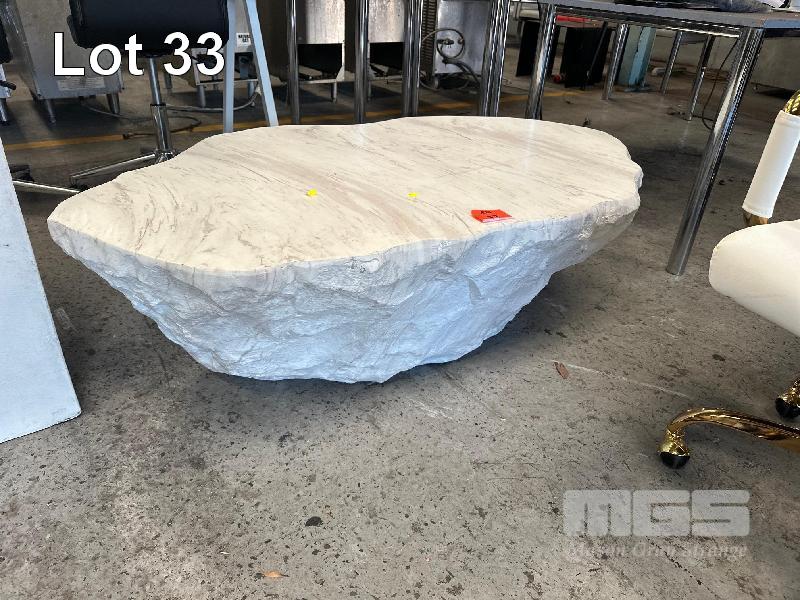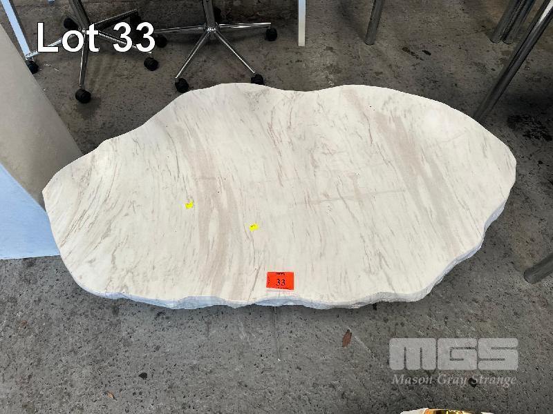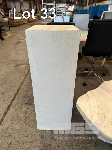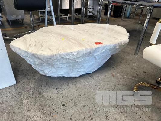 FIBREGLASS MARBLE LOOK COFFEE TABLE, 1400mm (L) x 400mm (H) FIBREGLASS PEDASTOOL, 1000mm (H)