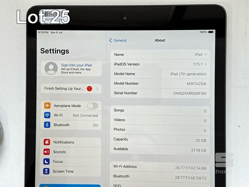 APPLE iPAD 7TH GEN, 32GB, Wi-Fi, SPACE GREY, MODEL MW742X/A, A2197 WITH CABLE & CHARGER (NOTE: MINOR SCRATCHES ON SCREEN) S/N:DMQZKMRDMF3M