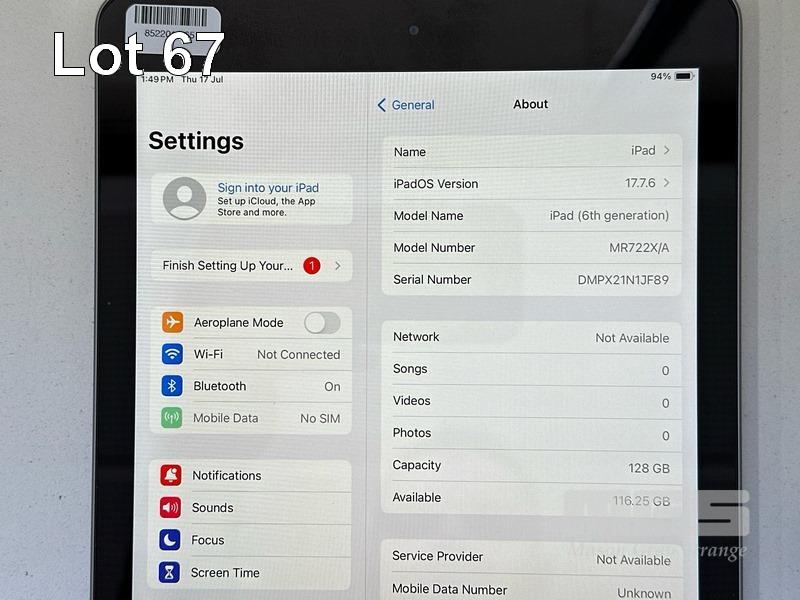 APPLE iPAD 6TH GEN, 128GB, Wi-Fi, CELLULAR, SPACE GREY, MODEL MR722X/A, A1954 (NO CABLE, NO CHARGER) S/N:DMPX21N1JF89