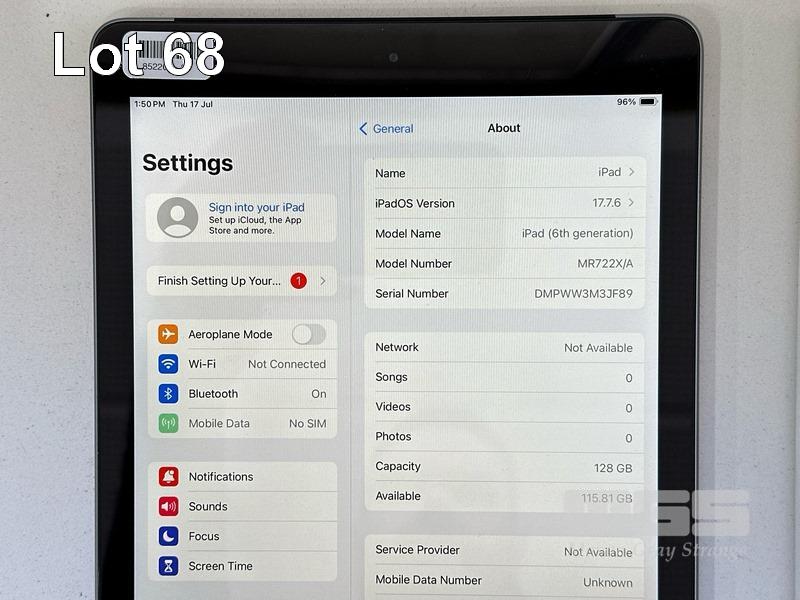 APPLE iPAD 6TH GEN, 128GB, Wi-Fi, CELLULAR, SPACE GREY, MODEL MR722X/A, A1954 (NO CABLE, NO CHARGER) S/N:DMPWW3M3JF89