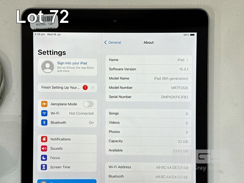 APPLE iPAD 6TH GEN, 32GB, Wi-Fi, SPACE GREY, MODEL MR7F2X/A, A1893 WITH CABLE & CHARGER (NOTE: TOUCH ID FAULT, MINOR SCRATCHES ON SCREEN) S/N:DMPXDKFKJF8J
