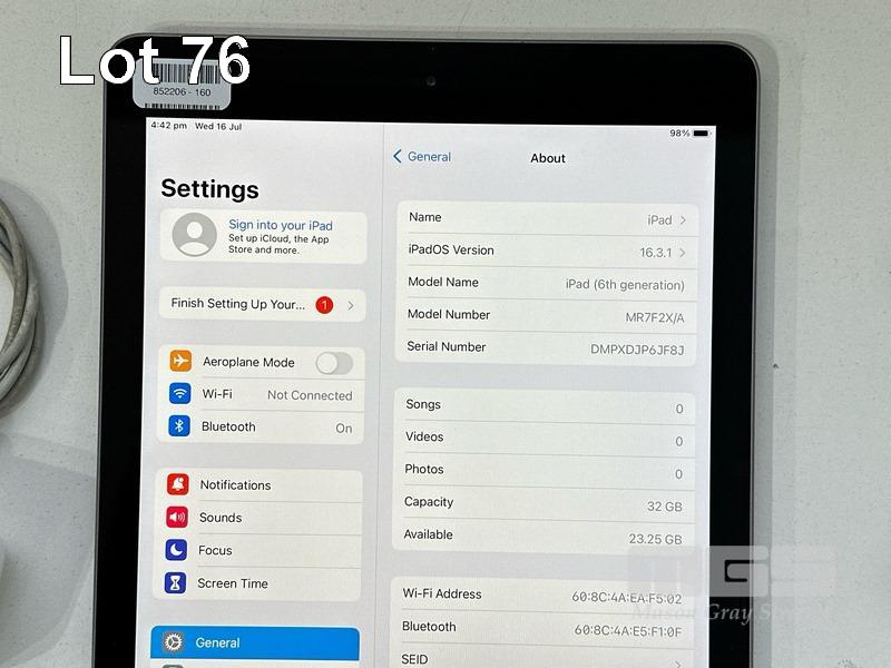 APPLE iPAD 6TH GEN, 32GB, Wi-Fi, SPACE GREY, MODEL MR7F2X/A, A1893 WITH CABLE & CHARGER (NOTE: MINOR SCRATCHES ON SCREEN) S/N:DMPXDJP6JF8J