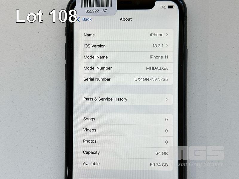 APPLE iPHONE 11, 64GB, MODEL MHDA3X/A, A2221, BLACK, BATTERY HEALTH 76% (NO CABLE, NO CHARGER) (NOTE: BATTERY SERVICE MESSAGE) S/N:DX4GN7NVN735