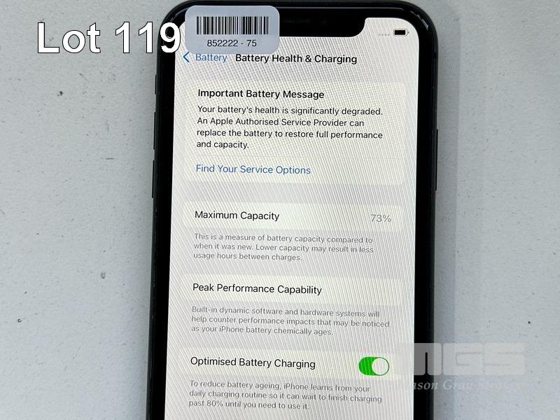 APPLE iPHONE 11, 64GB, MODEL MHDA3X/A, A2221, BLACK, BATTERY HEALTH 73% (NO CABLE, NO CHARGER) (NOTE: BATTERY SERVICE MESSAGE, MINOR SCRATCHES ON SCREEN) S/N:DX3H3814N735