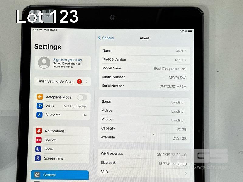 APPLE iPAD 7TH GEN, 32GB, Wi-Fi, SPACE GREY, MODEL MW742X/A, A2197 WITH CABLE & CHARGER (NOTE: SCREEN BLEMISH, MINOR SCRATCHES ON SCREEN) S/N:DMTZLJZ1MF3M