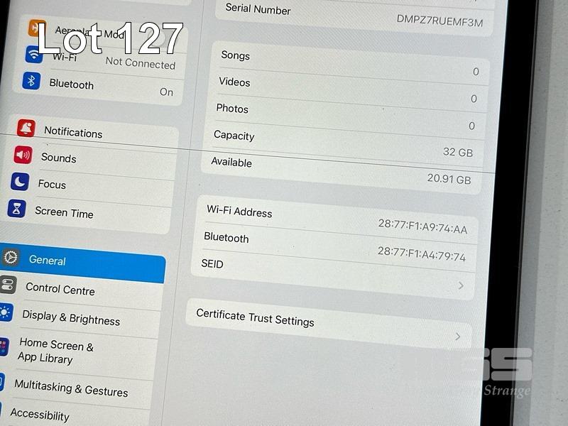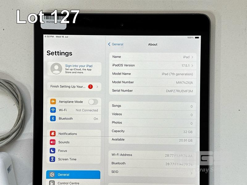 APPLE iPAD 7TH GEN, 32GB, Wi-Fi, SPACE GREY, MODEL MW742X/A, A2197 WITH CABLE & CHARGER (NOTE: LINE ON SCREEN, MINOR SCRATCHES ON SCREEN) S/N:DMPZ7RUEMF3M