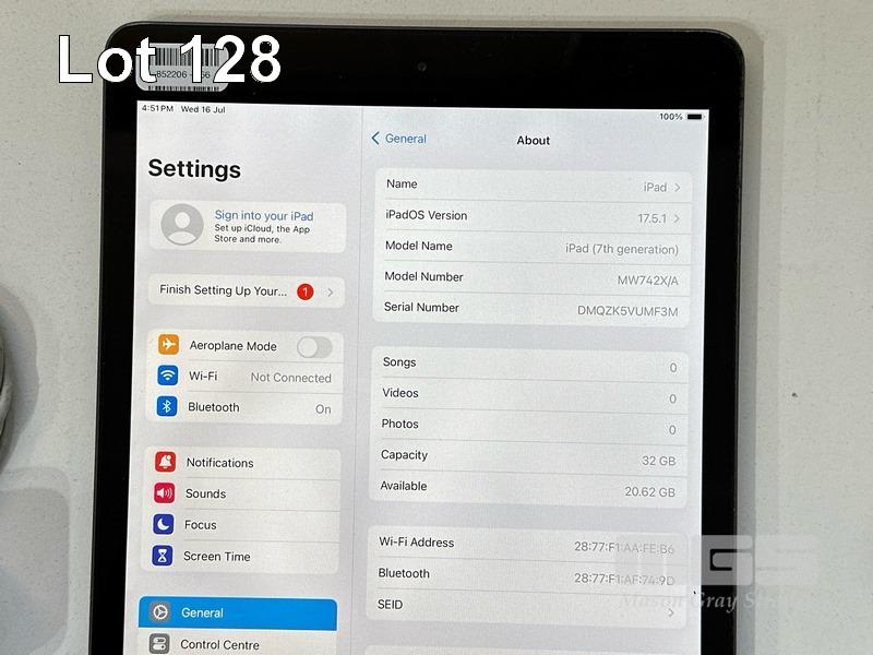 APPLE iPAD 7TH GEN, 32GB, Wi-Fi, SPACE GREY, MODEL MW742X/A, A2197 WITH CABLE & CHARGER (NOTE: SCREEN BLEMISHES, MINOR SCRATCHES ON SCREEN) S/N:DMQZK5VUMF3M