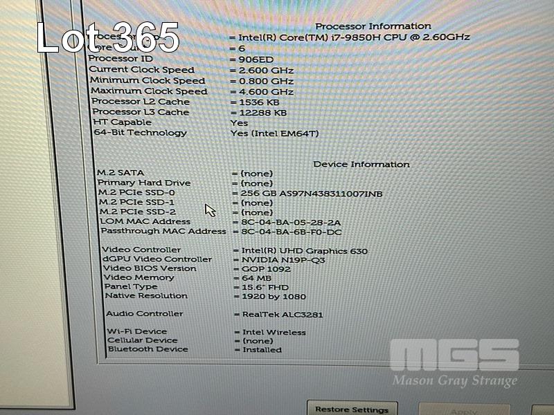 LAPTOP, DELL PRECISION 7540, CORE i7 9850H (9TH GEN) @ 2.6GHz, 32GB DDR4 RAM, 256GB NVMe M.2 SSD, 15.6" WIDESCREEN (1920x1080), 4GB NVIDIA QUADRO T2000 VIDEO, Wi-Fi, BLUETOOTH, WINDOWS 11 PRO INSTALLED & POWER SUPPLY (NOTE: BATTERY NOT HOLDING CHARGE) S/N:HGZG0Z2