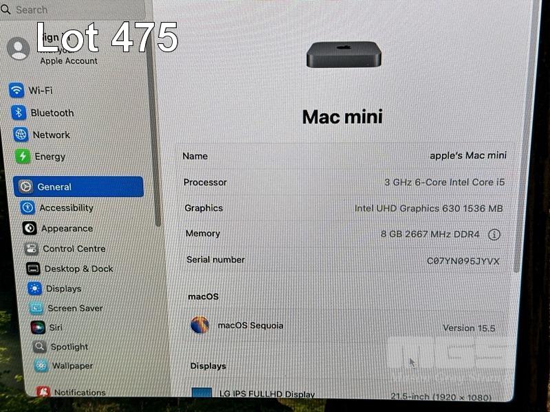 APPLE MAC MINI (A1993), CORE i5 8500B (8TH GEN) @ 3GHz, 8GB DDR4 RAM, 256GB SSD, INTEL UHD GRAPHICS 630, Wi-Fi, BLUETOOTH, MAC OS 15 INSTALLED, KEYBOARD (A1843) & MOUSE (A1657) (NO CABLE) S/N:C07YN095JYVX