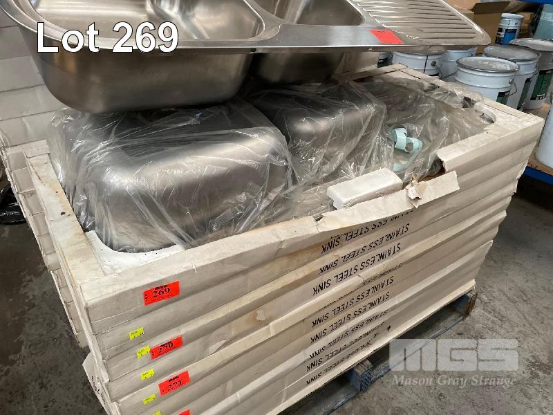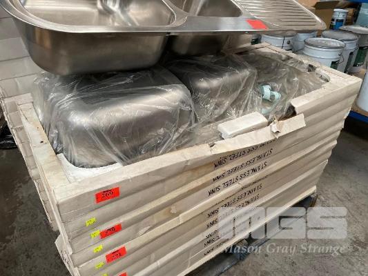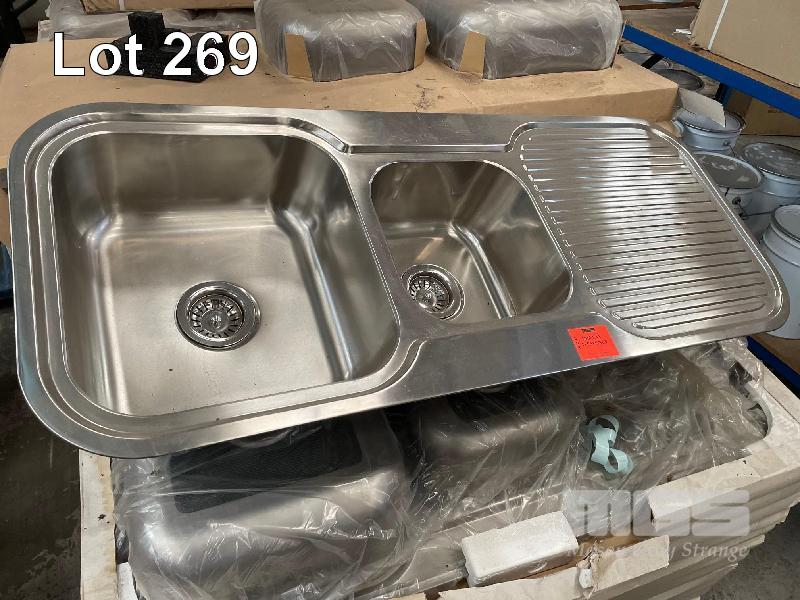 2 x STAINLESS STEEL, TWIN BOWL SINKS, 1180 x 480mm WITH FITTINGS AS NEW