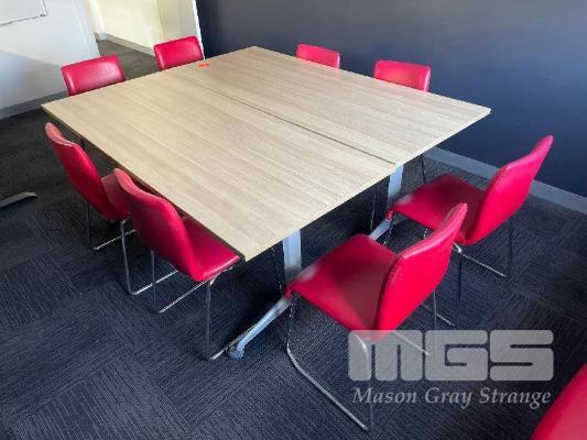 2 x MEETING TABLES, TILTING TOPS, MOBILE TILTING SPACE SAVERS, PINE LAMINATE TOP, STEEL FRAME, + 12 x RED VINYL CHROME FRAME CHAIRS