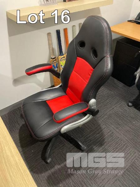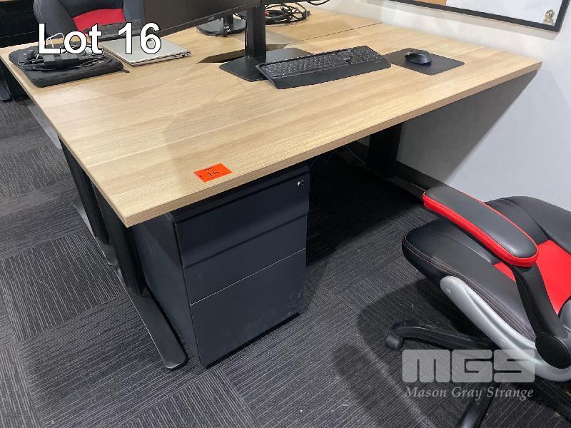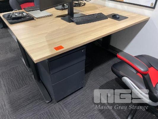 DESK, PINE LAMINATE TOP, BLACK STEEL FRAME, 1500 x 750mm + GAS LIFT CHAIR, RED & BLACK VINYL, 3 DRAWER UNDER DESK MOBILE