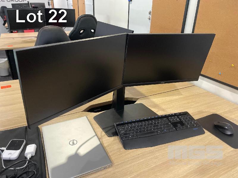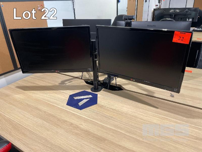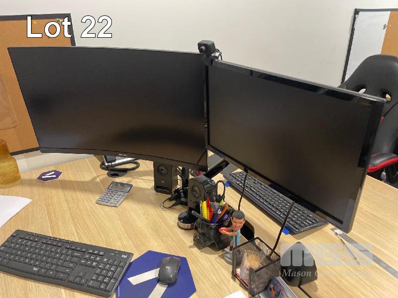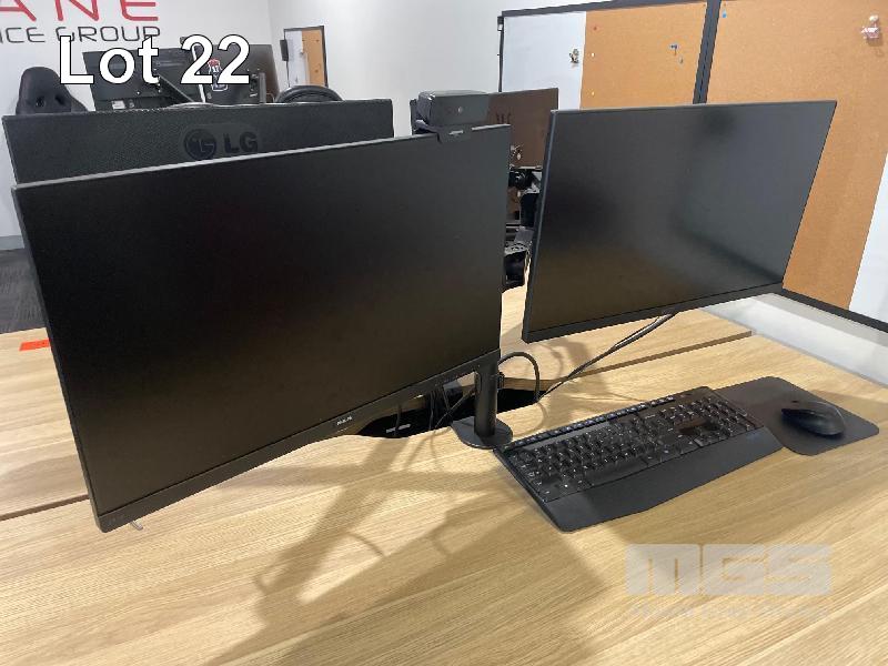 9 x 22" MONITORS, PHILLIPS, LG & ACER, 4 x DUAL MONITOR STANDS, 6 x KEYBOARDS & ASSORTED OFFICE SUNDIRES