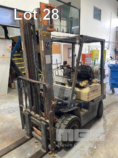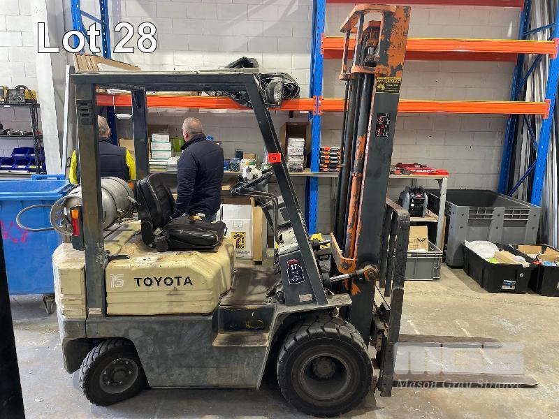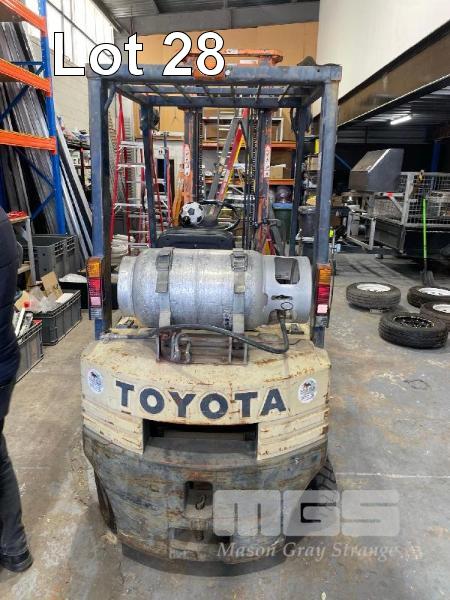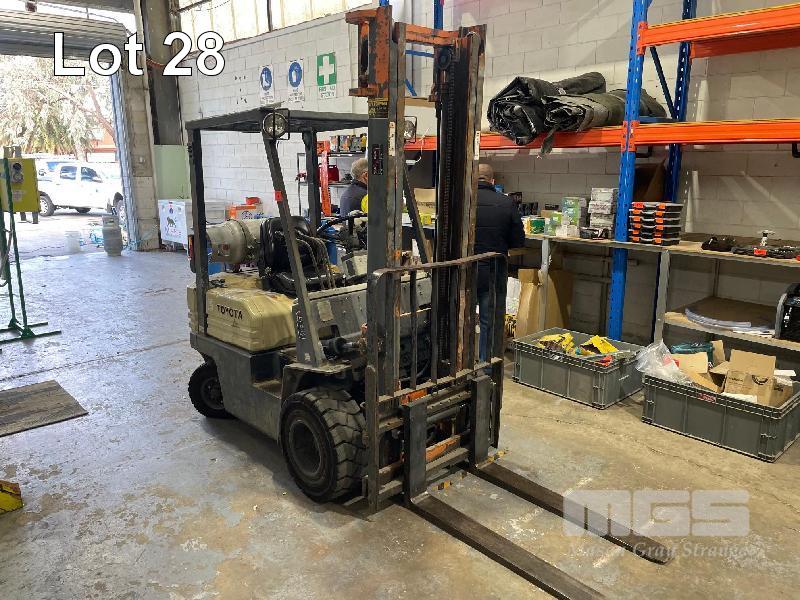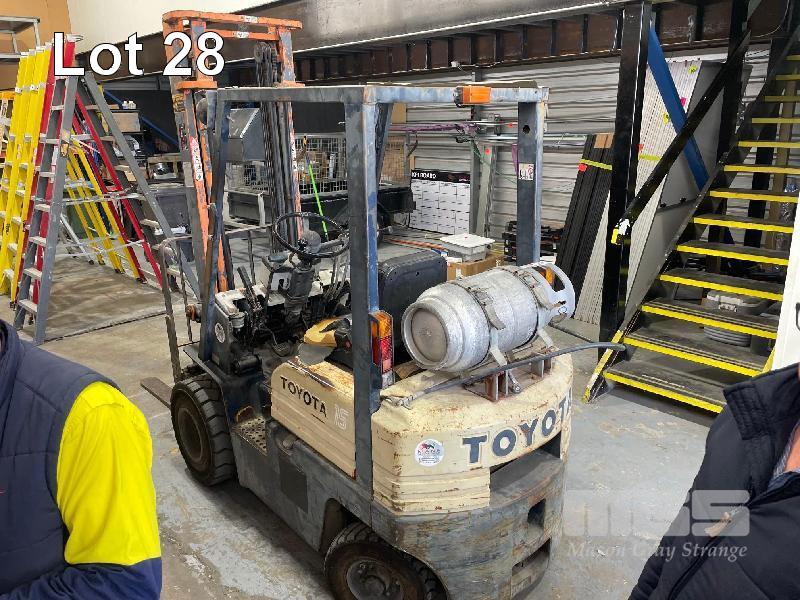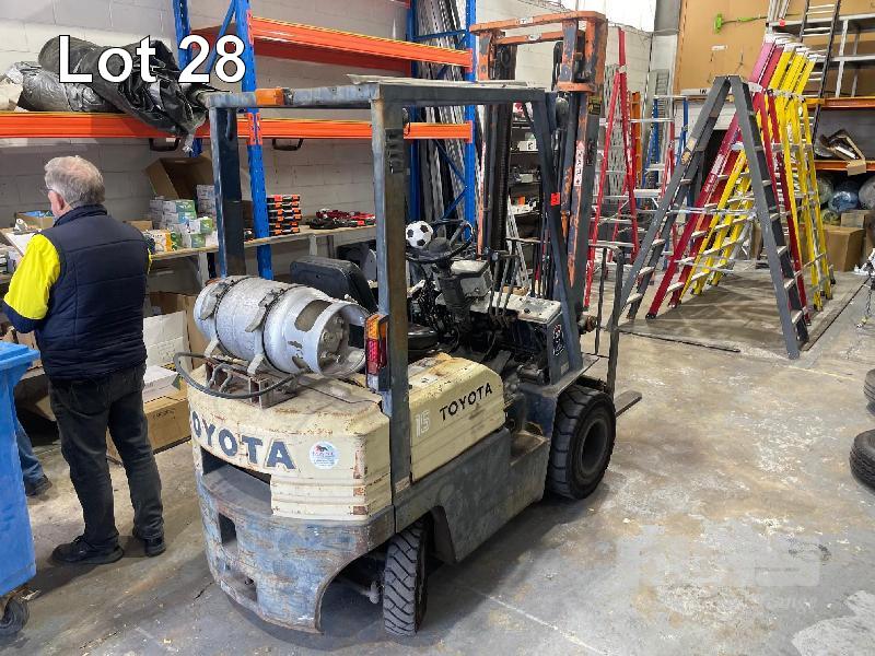 TOYOTA FORKLIFT, MOD: 02-5FG15, LIFT CAP: 1350kg, HRS: 7,404, LPG WITH SIDE SHIFT, SOLID FRONT TYRES, REAR PNEUMATIC TYRES, NOTE: ROUGH BUT RUNS, DRIVES & LIFTS