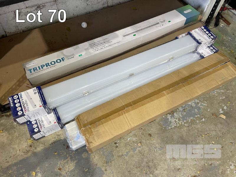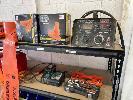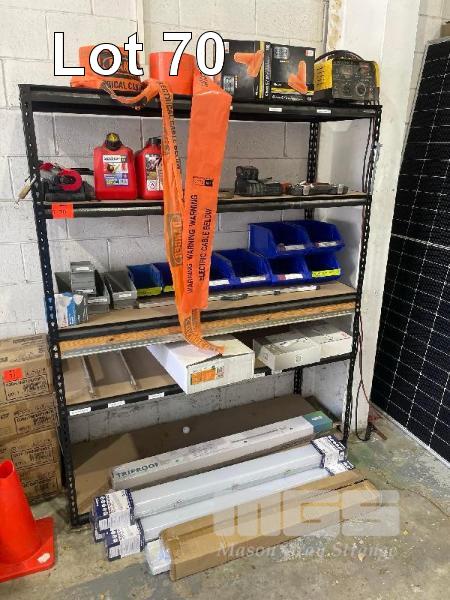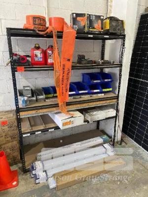 CONTENTS OF RACK, LED FLUROS, ABB SPITFIRE LIGHTS, PLASTIC TUBS, TOOLS, BATTERY CHARGER