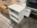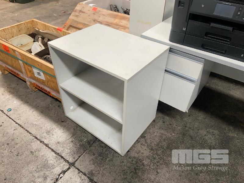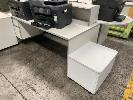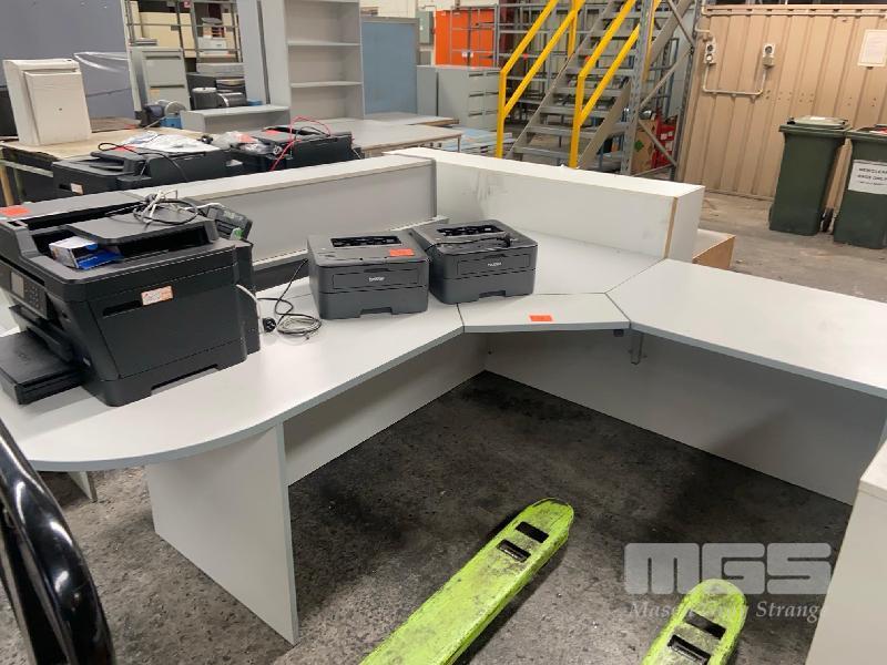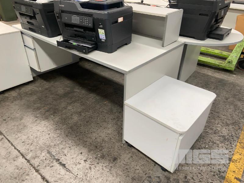 CORNER DESK, TEARDROP STYLE, LIGHT GREY LAMINATE, 2 x MOBILES & LOWLINE BOOKSHELF